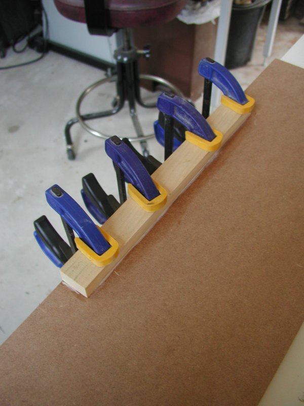 I started by gluing on the two cross braces one at a time to the mdf base using a flat table surface to clamp the assembly to in order to ensure a flat assembly. Since the cuts would be very shallow using the cross cut sled only for fret slotting duties, I glued the braces flat as opposed to vertically for a greater gluing surface area and since the added stiffness wasn’t necessary in the vertical direction.