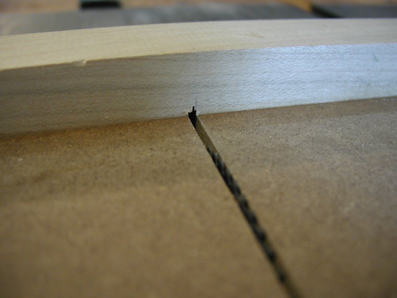 The very thin blade of the slotting saw has a non-cutting raised section that acts as a built in stiffener. To clear this part of the blade, I ran a pass with a 1/8th inch wide table saw blade that just pierced the top surface of the mdf. This allowed the fret slotting blade to pass through the 1/2 inch thick mdf and the .07 inches into the fretboard to make the fret slot without the non-cutting stiffener contacting the sled. The last step was to install the slotting blade, cut a reference slot and then extend that line up in pencil so I could later tell where the slot would be on the fretboard.